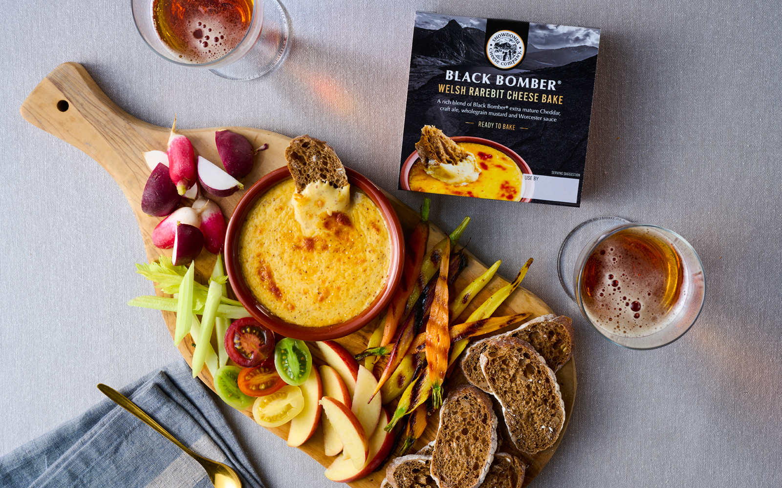 This deliciously rich and creamy cheese bake celebrates the flavours of a classic Welsh rarebit, combining Black Bomber extra mature Cheddar with mustard, craft ale and a splash of Worcester sauce. Presented in a reusable terracotta ramekin, all you need to do is bake it in the oven until bubbling hot and serve it with rustic sourdough bread, slices of apple and a long glass of golden ale.